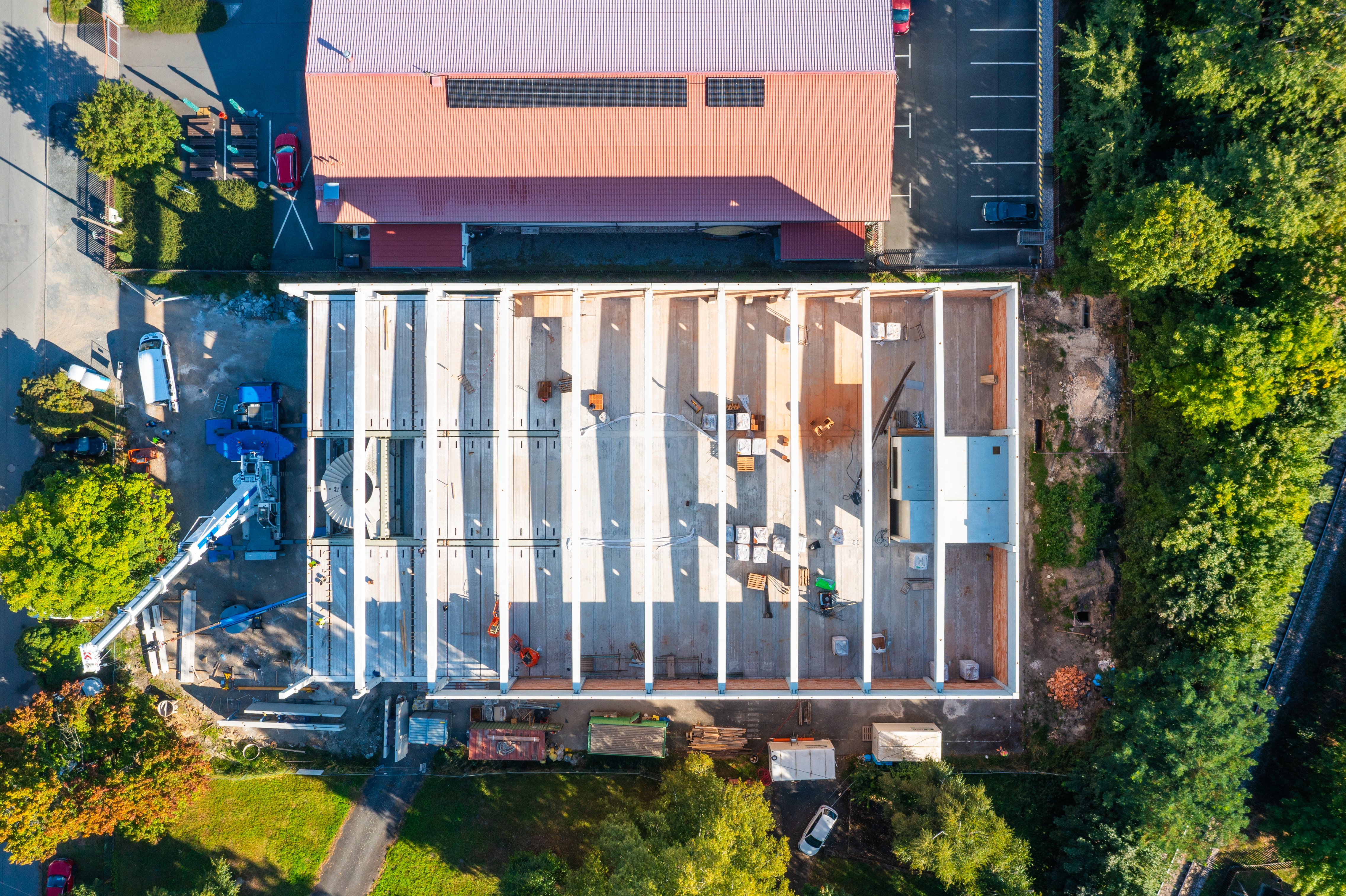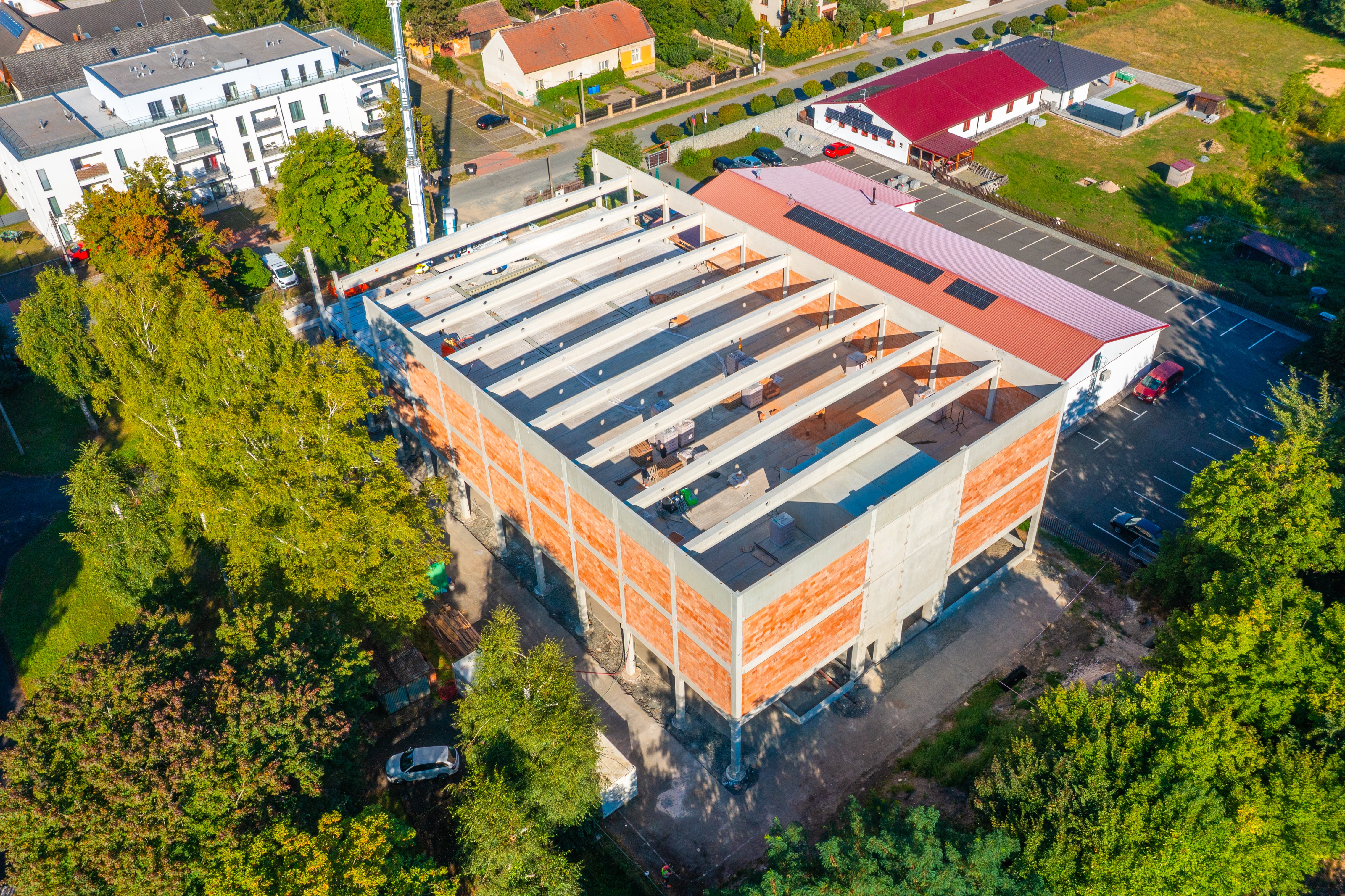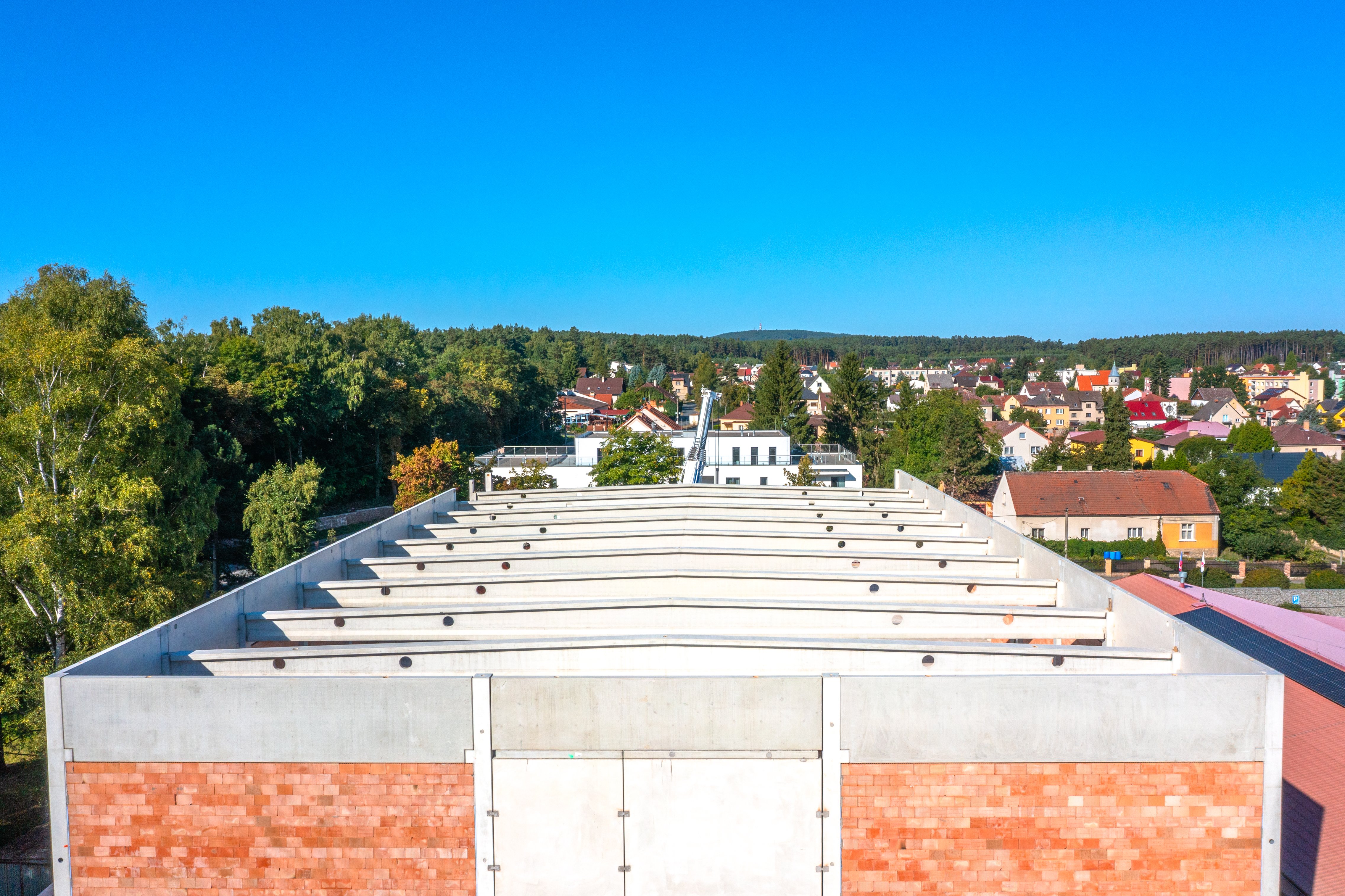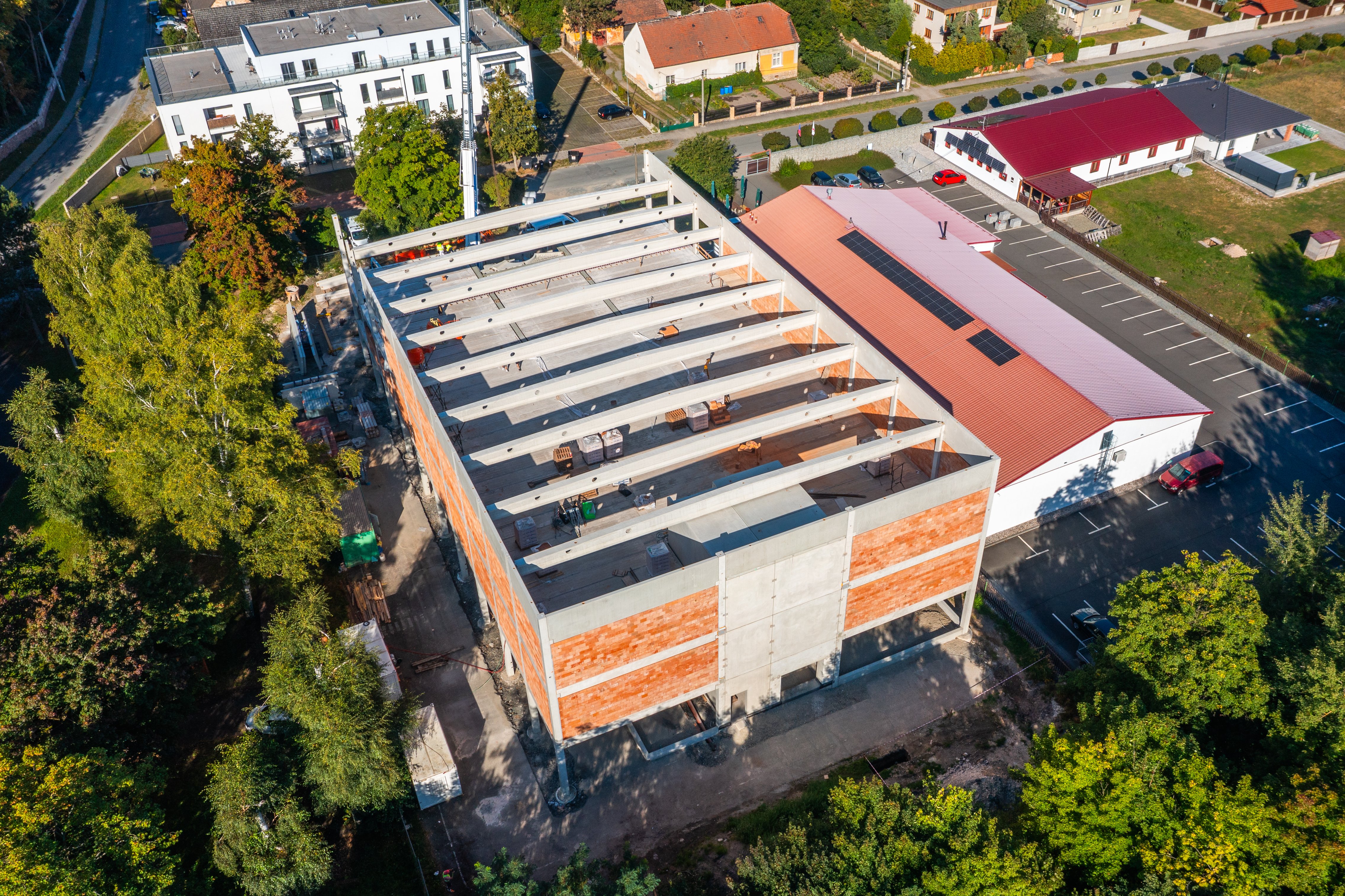 Zastřešení je provedeno předpjatými střešními vazníky průřezu I uloženými na obvodové sloupy. Ve střešní rovině jsou sloupy doplněny parapetními atikovými stěnami. Objekt je doplněn vnitřním blokem nákladního výtahu a schodiště tvořenými prefabrikovanými prvky.